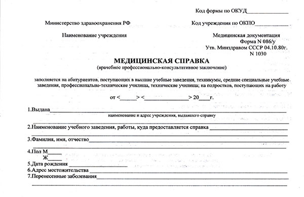 Медсправка 086/у – это документ делового стиля, который предназначен для выпускников средних школ, училищ и техникумов, иных общеобразовательных учреждений при поступлении в высшее учебное заведение. Документ выдается сроком на 1 год. При непоступлении в вуз абитуриент должен получить в следующем году повторно данную справку.