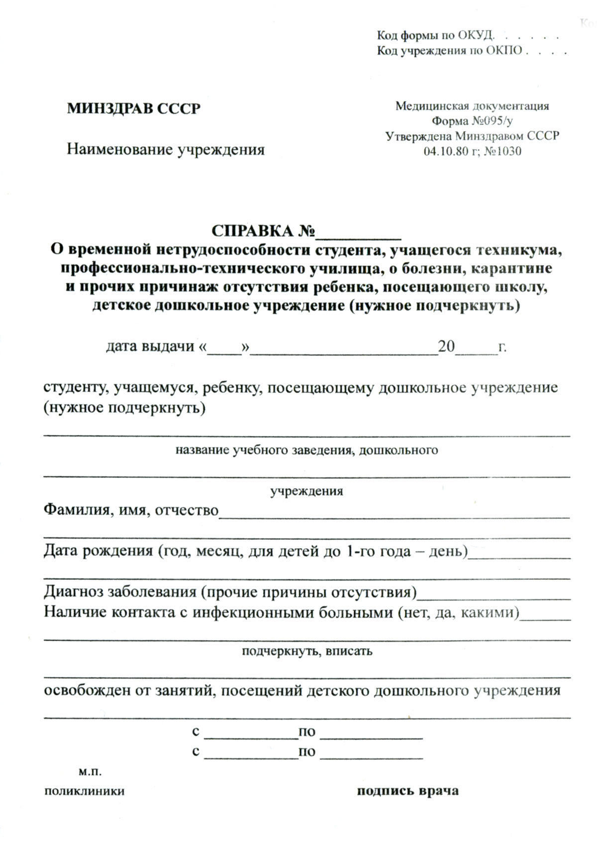 Документ, который выдается дошкольникам, учащимся школ, техникумов или профтехучилищ, высших учебных заведений при непоявлении на лекциях или в классе. Иными словами, медицинская бумага данного типа – это справка о временной нетрудоспособности человека. Медсправка 095/у свидетельствует о существовании хронического или временного заболевания и отсутствии во время учебного процесса.